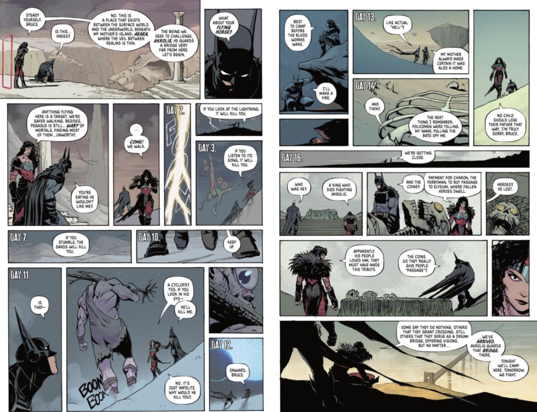 After getting verbally attacked for his mistakes by his friends, Bruce uses the token from Diana to summon her with the hopes that she knows of a spell to reverse Waylon’s transformation before it’s too late. Despite not having anything that can help, she offers him passage to a realm that has the tools he needs, summing up the growing strength of their unlikely friendship.
