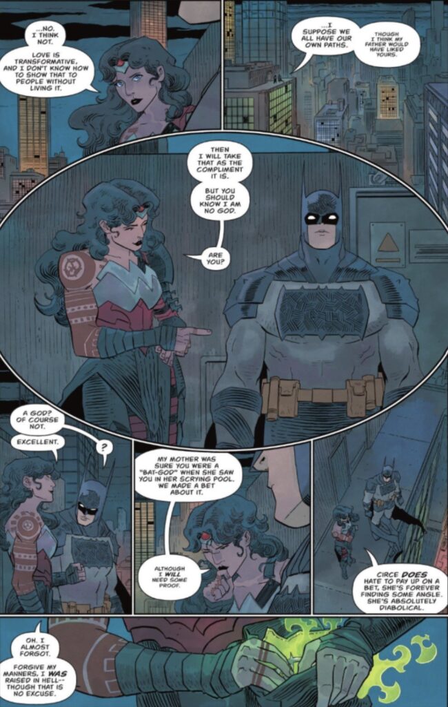 For now, they have these two crossover issues. Kalyn Thompson, the writer, deeply understands Diana and Bruce’s friendship, and that’s abundantly clear across the mystery arc issue #15 follows. When Diana summons Bruce to a rooftop in Gotham with her own magical bat signal, the two immediately respect each other even though they’re wildly different people. They both have heard of the others’ work in their own cities, and readers get an excellent conversation about magic and the responsibility these heroes hold as protectors towards the people around them. Diana also gifts Bruce with a token that will alert her to his need when called upon. The unconventional panel structure consistent with the rest of the Absolute Wonder Woman issues adds a layer of whimsy to this serious team up.